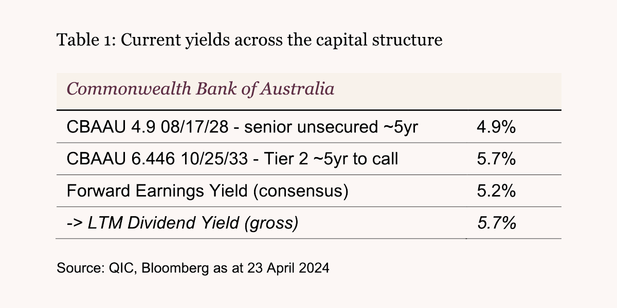 The example in Table 1, using the Commonwealth Bank of Australia at the issuer level, demonstrates how investors can earn a similar yield to equity with lower risk by moving up the capital structure into debt issuance, given the high yields currently on offer.