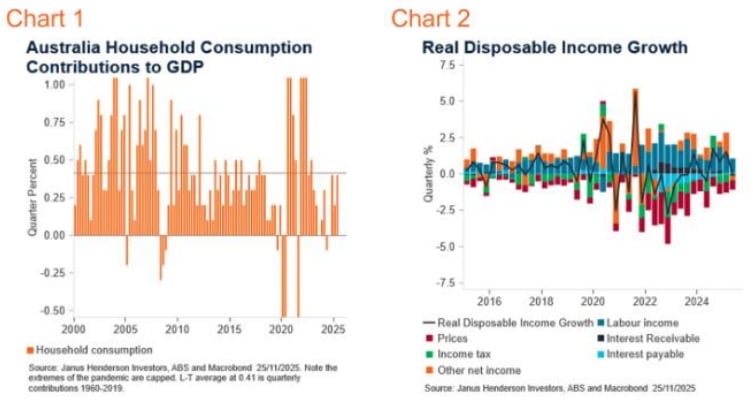 Household consumption only returned to its long-term average quarterly growth rate in Q2, 2025 after almost two years of sub-par spending (Chart 1). Chart 2 shows the sources of the increase in real disposable income, which allows for a rise in household consumption. After a pronounced period where interest costs rose, in response to a tightening of monetary policy, these eased as the RBA lowered the cash rate from February 2025. If consumers are concerned that the RBA are done with easing, that lift to incomes from lower cash rates fades as a tailwind to spending.