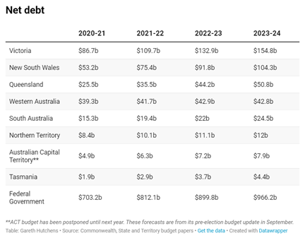 Victoria has the largest net debt of any of the states and territories, as shown in the table below.