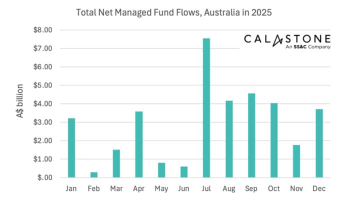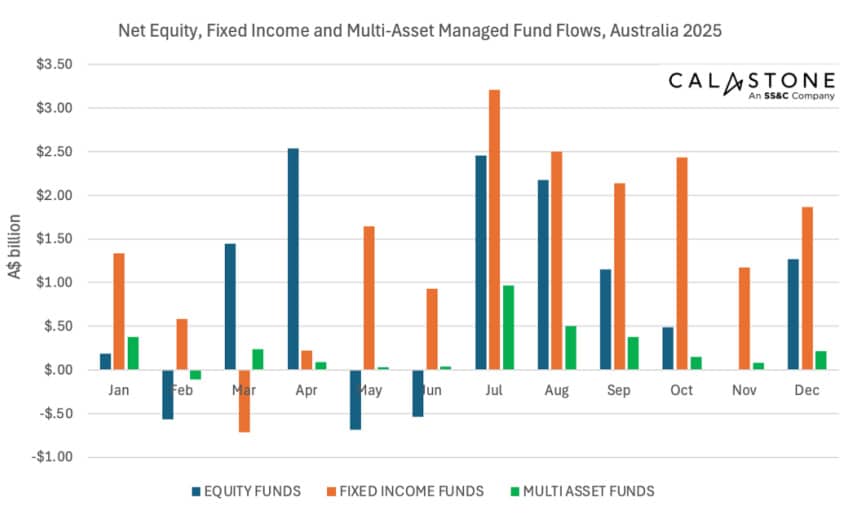 Australian managed funds attracted $35.9bn of net inflows in 2025, led by fixed income strategies as investors prioritised stability amid ongoing trade and geopolitical uncertainty, according to Calastone’s latest fund flow data. As market conditions improved through the year, equity demand rebounded, signalling a gradual but confident re-engagement with risk assets.