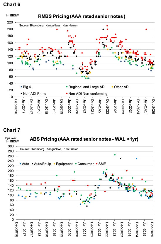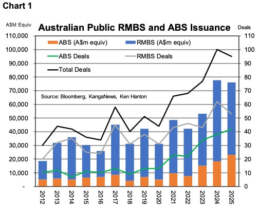 By collateral type there were 53 public RMBS deals in 2025 for total AUD equivalent issuance of $52.9bn versus 62 deals for $59.2 bn in FY24. And going from strength to strength, there were 42 public ABS deals in 2025 for $23.1bn versus 38 deals for $18.5bn, which is comfortably a new all-time record for the market.