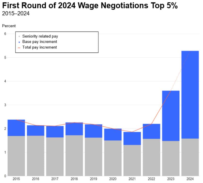 “Even if we consider a marginal adjustment lower, a full year pay increase of close to 5% will still be the highest recorded wage gain since 1991. The second and third rounds of the negotiations will be declared on March 22 and April 4, respectively.