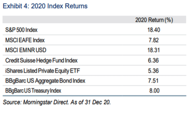 In 2020, when many investors questioned the return prospects for The Bloomberg Fixed Income US Aggregate Bond Index, it returned 7.51%, and clearly outpaced private equity and hedge funds.