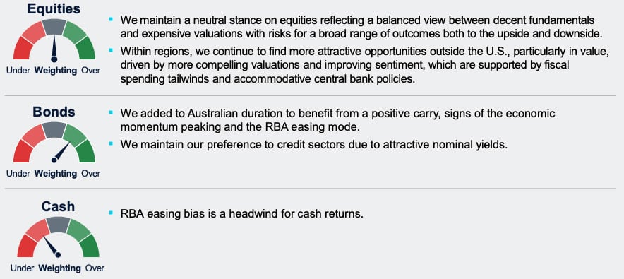 We maintain a balanced view on risk assets, buoyed by fiscal stimulus and accommodative central bank policies helping support economic growth, against a backdrop of elevated valuations and lingering inflation.