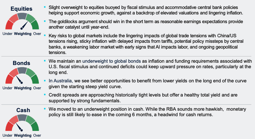 After a near 40% uninterrupted run higher off early April lows around Liberation Day, U.S. equity markets have been a bit more jittery as of late. High valuations, scrutiny around AI spending and more recent focus on debt financing for AI infrastructure have been highlighted as catalysts of concern. Adding to these worries has been the ongoing U.S. government shutdown, incoming private data showing a weakening labor market, slumping consumer confidence and the direction of the Fed mired by a lack of information. On the flip side, earnings growth remains robust, M&A activity has picked up and the narrative around supportive fiscal and monetary policy still holds. AI spending, however, has been the primary driver of economic growth, earnings, and market performance, offsetting weakness elsewhere in areas like housing, manufacturing, and the labor market. Given these imbalances we remain broadly neutral across risk assets, and cognizant of the growing bifurcations across the economy.