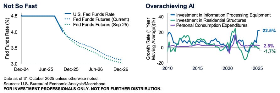 U.S. economic growth is underpinned by ongoing fiscal spending and potential for further Fed easing, though outlook remains uncertain amid limited economic data and a lack of clarity around tariff impact.