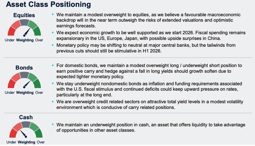 We maintain a relatively balanced view across global risk assets with a modest overweight in equities. Despite extended valuations, earnings trends and economic growth remain favorable, supported by fiscal and monetary policies in most regions.