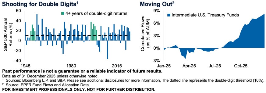 The U.S. equity bull market is now entering its fourth year, having put up double-digit returns in each of the past three, leaving investors wondering whether it can keep the streak alive. While multi-year stretches of positive equity market returns are common, delivering double-digit returns four years in row are few and far between. The naysayers point to elevated valuations, narrowness of the market, uncertainty around Fed policy amid leadership change, a softening labor market, and U.S. mid-term election risk. Yet history has shown bull markets don’t die of old age alone, and while valuations are elevated, they’re below prior cycle extremes. Bulls can also point to still robust earnings expectations, a broadening of AI beneficiaries, fiscal support, increased capex spending, deregulation, rising M&A activity, and easing trade tensions. With the risks reasonably balanced and momentum still intact, the path of least resistance for the equity market may continue to be higher for now—the question is can it reach double digits for the four-peat?