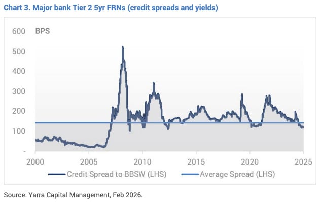 Given fixed income investors generally have a low tolerance for negative returns over a 12- month period, the use of significant leverage to enhance returns could be somewhat of a dubious exercise, especially when you consider today’s starting point. As evidenced by major bank T2s, credit spreads have performed over the last 2-3 years and now sit around their long term averages across most segments of Australian credit and significantly below the previous peak in 2022 (refer Chart 3).