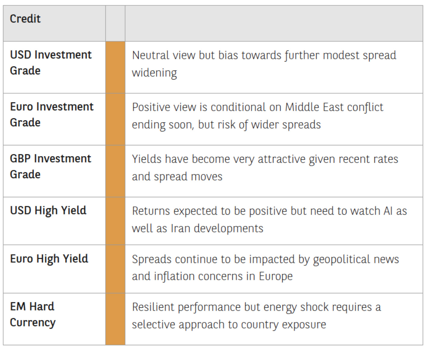 Money market and floating rate securities may also provide some defence when short-term rates are rising. These cash-like assets can help give investors potentially greater security in the short term, and provide liquidity to add to cheaper, riskier assets going forward. A prolonged conflict would worsen the inflation and growth outlook, sustaining interest rate volatility. However, de-escalation should reveal potential value opportunities in credit markets, where spreads have moved wider and all-in yields are at levels last seen in the second quarter of 2025. This scenario would also reduce the need for central banks to tighten policy, allowing short-term interest rate expectations to fall, potentially helping boost returns for short-duration fixed income.