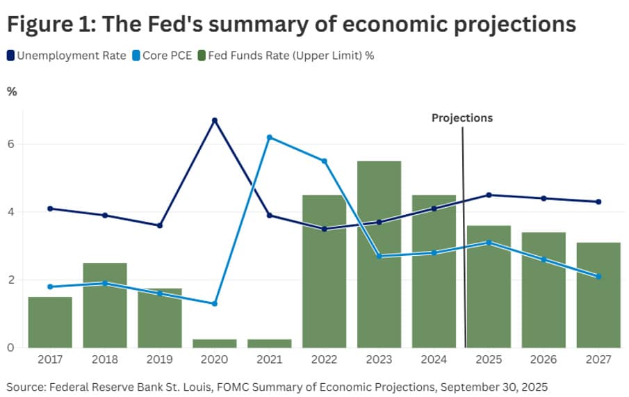 Defying market expectations and growing political pressure, the Fed paused for nine months before eventually resuming interest rate cuts a year into the cycle. Gradually, tariffs-driven uncertainty and resultant volatility gave way to investor consensus that the Fed’s dual mandate will be manageable going forward, rate cuts will continue toward a lower fed funds rate and a more dovish Fed and Chair will be in place in 2026.