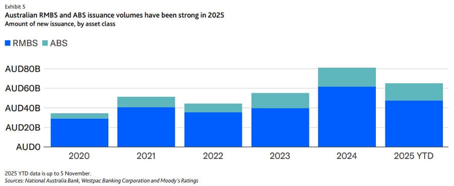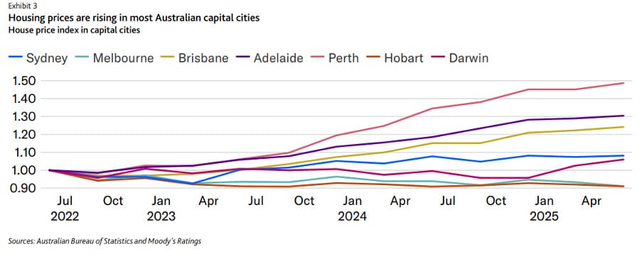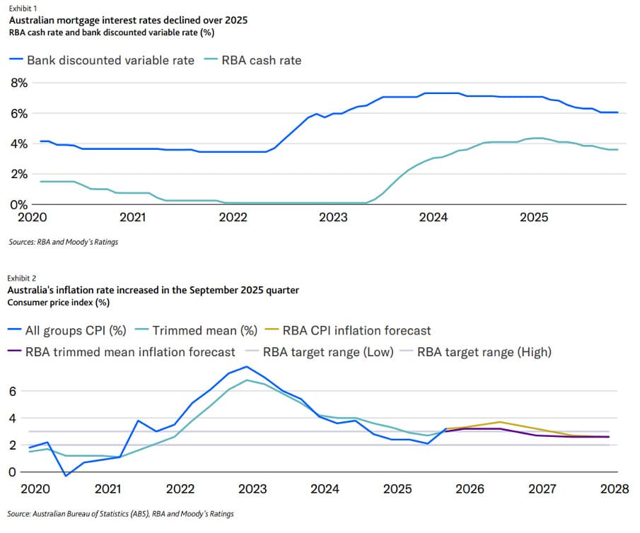 For the RMBS we rate, mortgage delinquency rates declined over 2025 as interest rates eased and we expect this positive trend to continue into 2026. Additionally, lower interest rates will support strong housing market conditions (Exhibit 3), which will limit losses for RMBS deals when mortgage borrowers default. The Australian government’s 5% deposit scheme for first homebuyers, which took effect in October, will also support borrowing capacity for first homebuyers, increasing demand for housing. Meanwhile, population growth and low building approvals will continue to challenge housing supply.