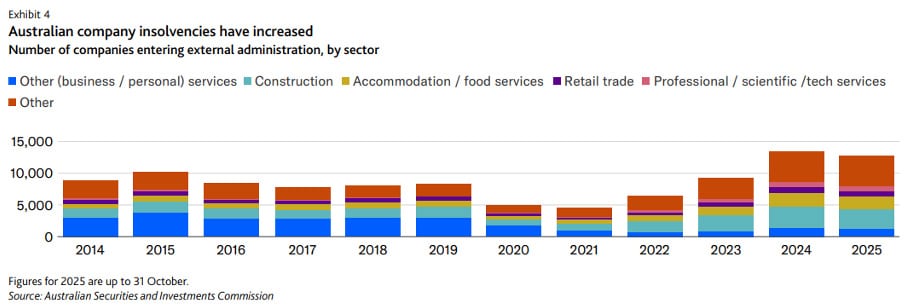 In the Australian ABS sector, asset performance will continue to vary from deal to deal across the auto ABS, personal loan ABS, and commercial auto and equipment finance ABS we rate. ABS assets are mostly fixed-rate loans, so there will be no direct benefit from the rate cuts in 2025. However, lower interest rates will support the economy in general and the credit quality of borrowers. For ABS deals with mostly prime-quality assets, performance will remain sound over 2026 and in some cases improve, given the economic backdrop. But asset performance risks will persist where underlying asset quality is weak or the deals are heavily exposed to underperforming areas of the economy, like parts of the construction sector for example. We expect business insolvency rates (Exhibit 4) to gradually decline but remain high in 2026, so ABS deals with exposure to commercial auto and equipment loans will pose a larger risk than deals that securitize loans to consumers.