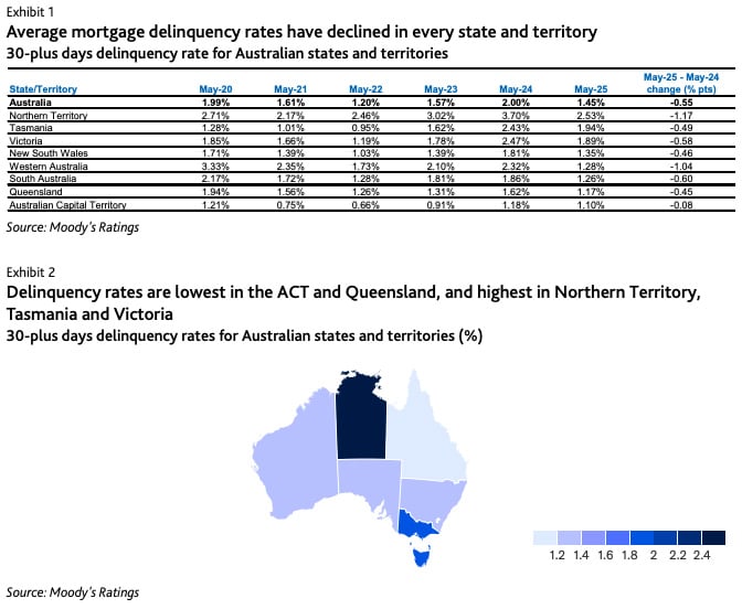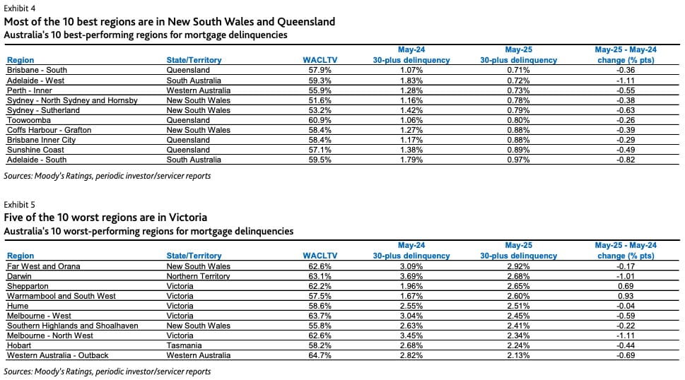 Mortgage delinquency rates, which have started to decline in most areas around Australia, are set to continue to go down over the next year as interest rate cuts make home loan repayments more affordable. Declining home loan delinquency rates are credit positive for Australian residential mortgage-backed securities (RMBS) we rate. However, pockets of weakness will remain in regions where housing market and employment conditions lag the rest of the country, with parts of Melbourne a notable area of risk.