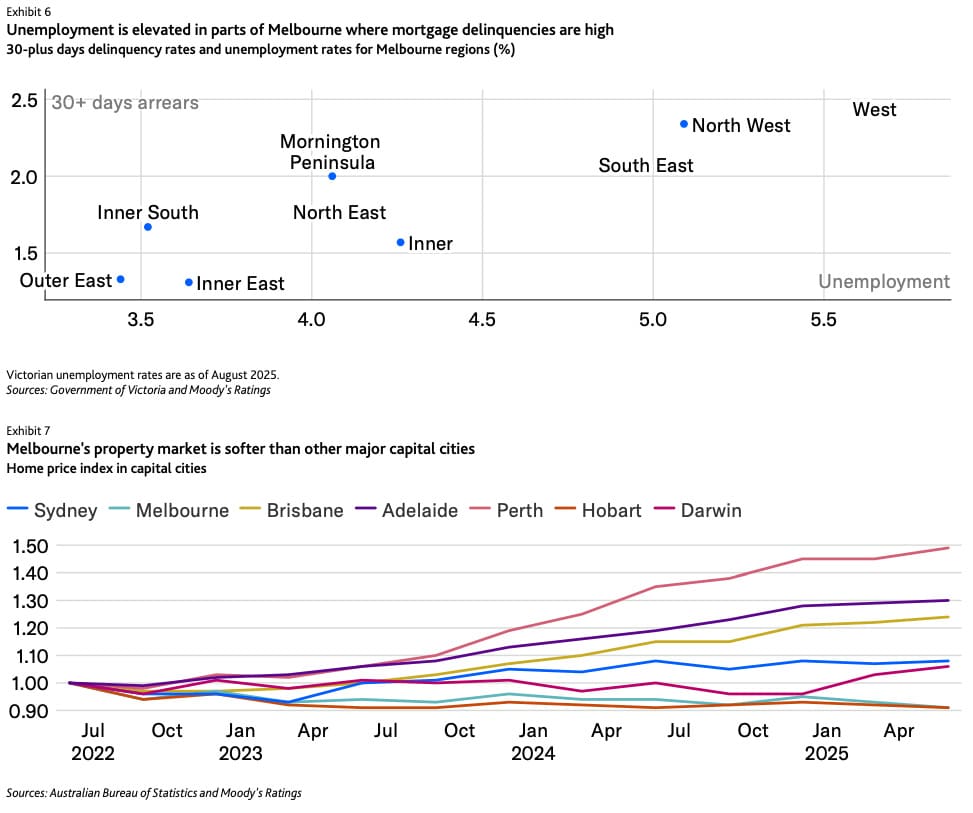 We expect parts of Melbourne where unemployment is relatively high and where the property market is soft will remain a weak spot for mortgage delinquencies over the next year. Mortgages on properties in Melbourne make up around 23% of the loans in Australian RMBS we rate.