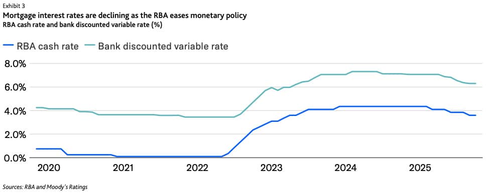 Interest rate cuts are the key reason why mortgage delinquency rates are improving. The Reserve Bank of Australia (RBA), which raised interest rates 13 times from May 2022 to November 2023, has cut rates three times this year, reducing the official cash rate to 3.60% from 4.35% (Exhibit 3). With inflation within the RBA’s target range, additional rate cuts are likely over the next few months, which will further reduce mortgage repayment amounts for floating-rate home loans and lead to lower delinquency rates.