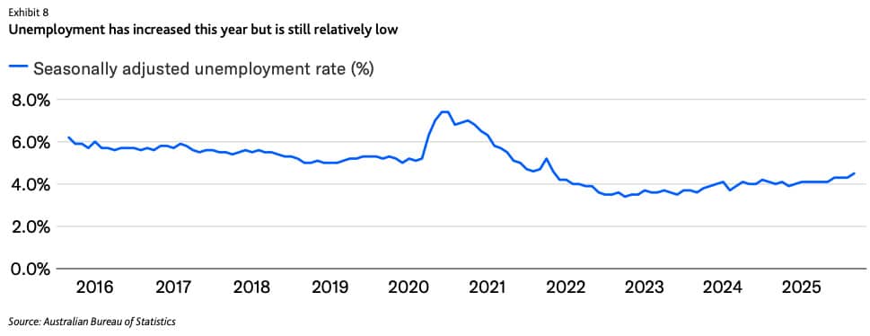 Employment conditions in Australia overall are relatively strong, despite an increase in the unemployment rate to 4.5% from 4.3% in September (Exhibit 8).