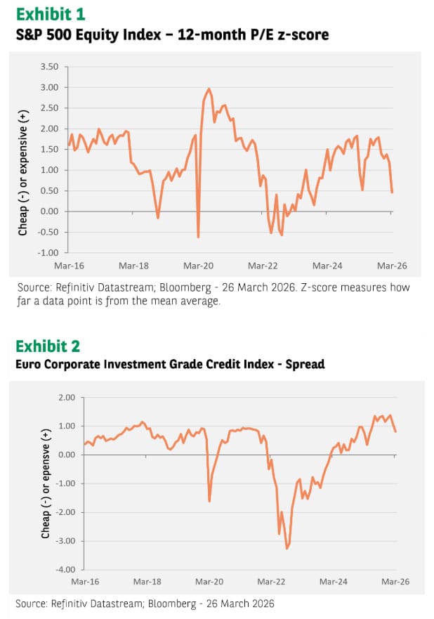I looked at where 12-month price-to-earnings ratios for equities, and option-adjusted spreads for credit, stand after more than three weeks of conflict relative to their averages of the last three years.