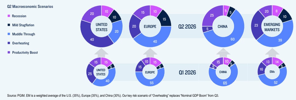 We start with our views on the war, which took another turn with the announced ceasefire at the time of publication. If the ceasefire falters, in our adverse scenario—“escalate to de-escalate”—the U.S. administration ratchets up the costs to the Iranian regime through various measures, such as potential strikes on power plants. The operational menu in this scenario is broad, and the constraint is risk tolerance. It thickens the tail risk towards a potential scenario involving a protracted cycle of intensification. This case prompts central banks into growth-stunting rate hikes and dislodged inflation expectations, while economic growth stalls or recedes across economies, and the trading environment unambiguously turns risk off.
