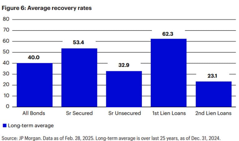 The implication of a higher proportion of secured bonds is that recovery rates in the case of default should be higher in the next default cycle. The average recovery rate for senior secured bonds has historically been 53% (Figure 6), which is comparable to first lien loans. This compares to a historical recovery rate of 33% on a typical high yield senior unsecured bond (Figure 6).