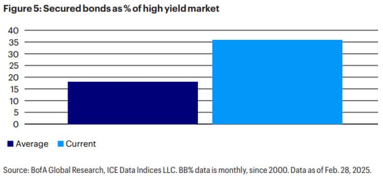 High yield has generally been populated by senior unsecured bonds since 2000. The average exposure of the index to senior secured bonds, on the other hand, has historically been only around 18% (Figure 5). In the past few years, a large number of secured bonds have been issued in the high yield market. Most were issued to refinance senior secured bank loans when it was more challenging to refinance in that market at attractive terms. As a result, today, nearly 36% of the high yield index is comprised of senior secured bonds (Figure 5).