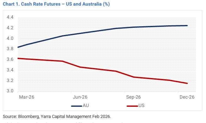In this instance, the direction change is Australia’s late 2025 bond selloff, culminating in a 25bp hike from the RBA this week and with the prospect of more hikes through 2026. Looking forward, current market pricing for 2026 shows a widening gap between the RBA cash rate and the FED funds rate, with the pricing of rate hikes in Australia in stark contrast to the US where easing appears virtually certain (refer Chart 1).