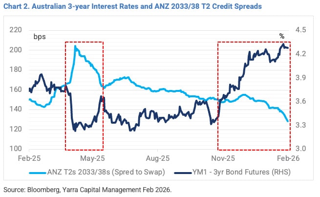 For us, higher bond yields in the closing months of 2025 enabled a rebuild of strategic duration at ~1.7 years across both our Enhanced Income and Higher Income funds. While market timing is never perfect, this duration positioning – where we have a skew to the front end – should help limit any drawdowns from risk offs in 2026. This period reminds us of April 2025, where both funds generated positive performance despite credit spreads moving materially wider. We believe a similar scenario can play out in 2026 (refer Chart 2).
