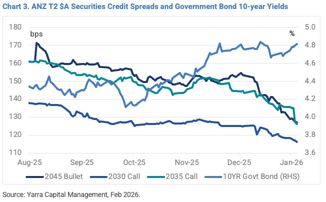 Another key theme through 2025 was the 6%+ “mania” which appears to be back with gusto. A pool of investors attracted to higher outright yields, especially longer dated major bank T2s, appear to be forgoing adequate credit spread compensation and happily accepting higher spread and interest rate duration risk to achieve their 6%+ yield objectives.