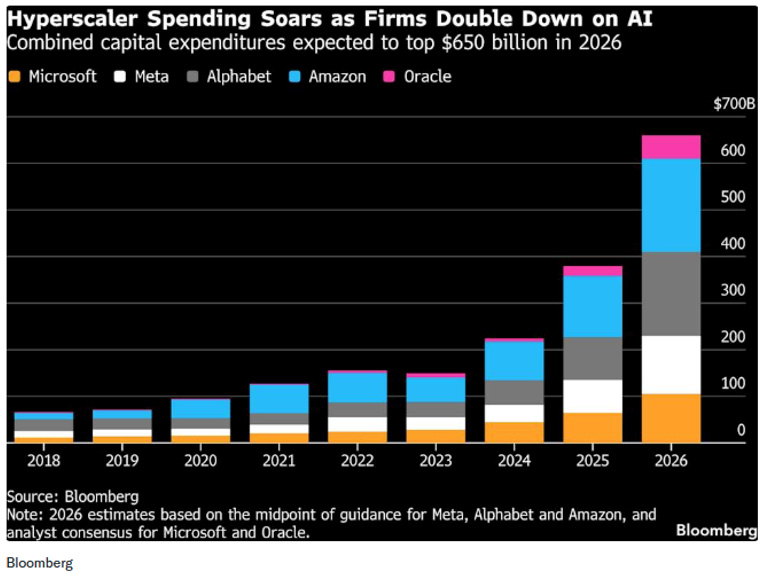 The five hyperscalers of the industry, Microsoft, Meta, Alphabet, Amazon and Oracle are projected to spend more than US$650 billion in 2026. The spending and capital needed to develop AI is growing exponentially, see the chart below.