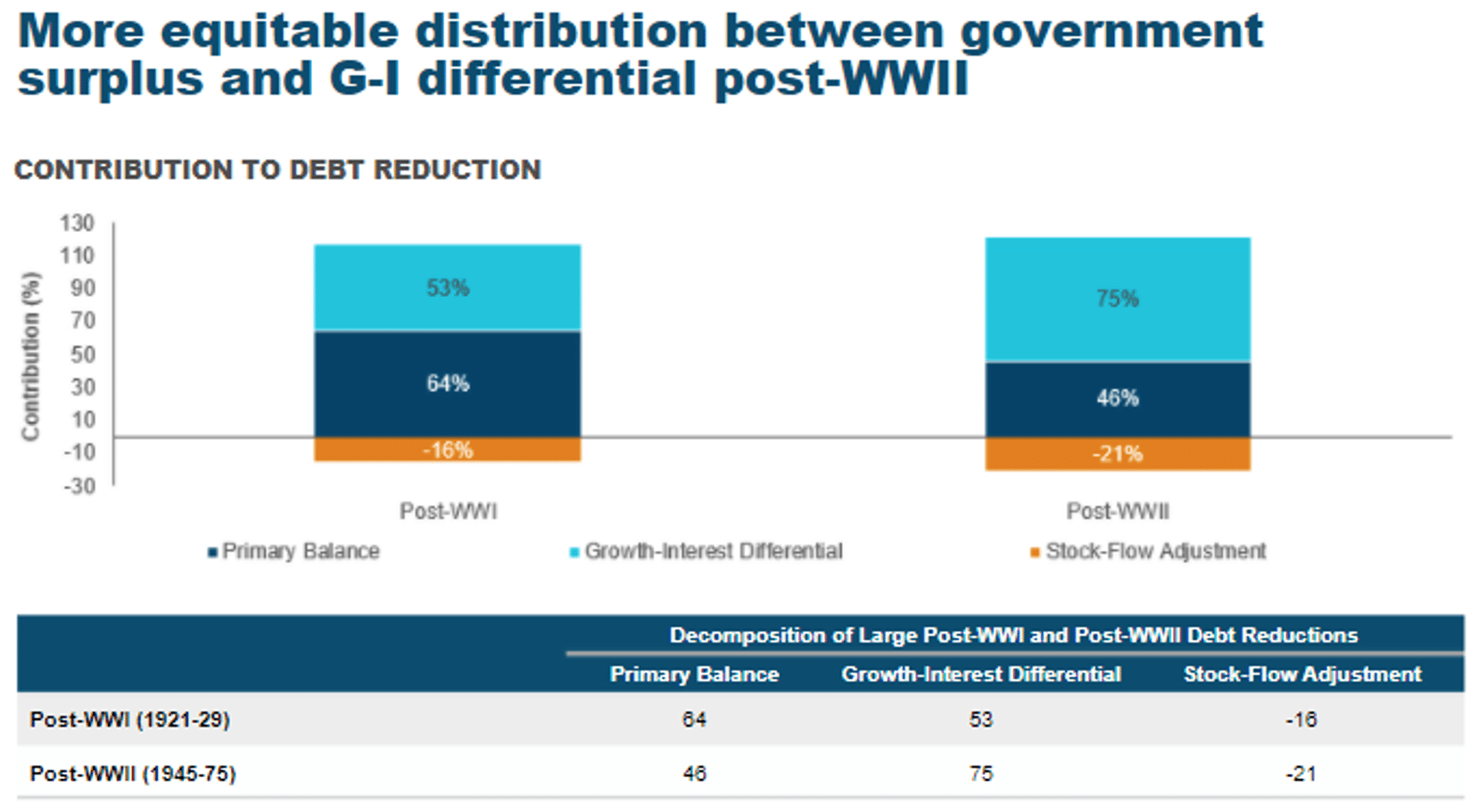 Moving on to the second debt crisis in the mid 1900s. What we have is almost an equal balance between the primary balance and the growth-interest rate differential. The great deleveraging was much more inclusive. Fiscal discipline was helped by a huge productivity boom and supportive population growth and some inflation along with that.